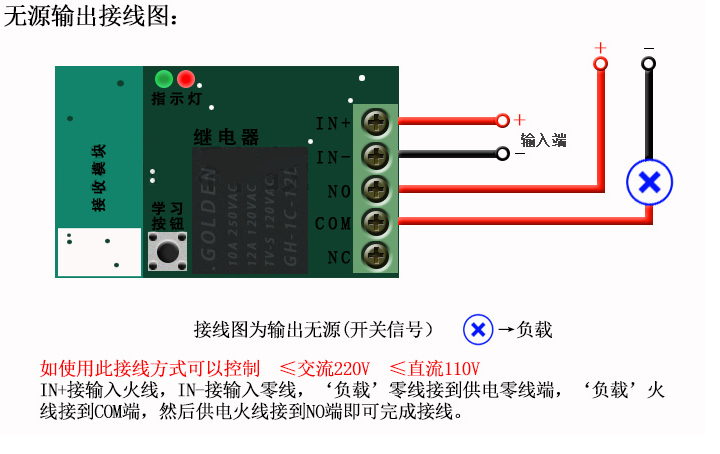 配套遙控器:選擇好工作方式后,按住學(xué)習(xí)按鍵不放,指示燈亮,松開(kāi)手,按所要配套的遙控器發(fā)射信號(hào),指示燈閃三下后滅,表示已經(jīng)學(xué)習(xí)好該遙控器此按鍵。如需多配遙控器,重新操作此步即可!