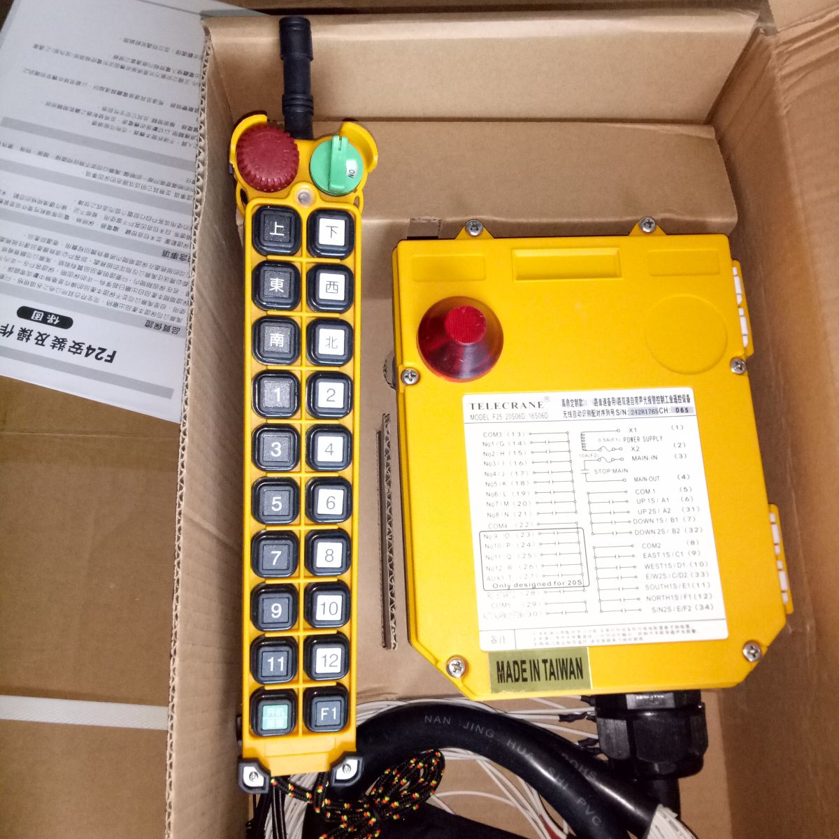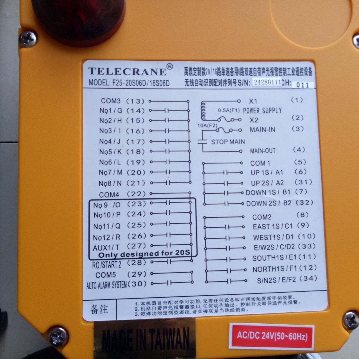 臺灣禹鼎定制型F25-20S 二十鍵工業(yè)設(shè)備遙控器,帶聲光報警功能! F25-20S 多功能起重機遙控器 20點單速起重機無線遙控器,比F24-12S的遙控器增加R7/R8/R9/R10/R11/R12/START/F1了等8個鍵,操作方便,這樣更能滿足更多客戶的需要!增加了聲光報警功能,配合聲光報警器使用,提高了工作的安全性! 21個常開控制繼電器輸出,無源接點,方便和PLC、繼電器、接觸器控制回路對接,適用各種控制電壓,客戶也可以根據(jù)需要實現(xiàn)多回路、多電壓等級控制。 發(fā)射器(手持)尺寸:28x6.1x5.1厘米 ? 天線長度5厘米 重量:約410克 ?(不含電池) 接收機 尺寸:21x16.2x10.7厘米 重量:2230克 產(chǎn)品特點: 控制距離:可達100米 。 安全碼:43億種以上。 使用溫度:-35℃至+80℃(不考慮電池耐溫)。 防護等級:IP65。 發(fā)射器電源:直流3V(2節(jié)堿性5號電池)。 接收機電源:交流380V或36V。可由電腦接口設(shè)定內(nèi)部功能。 16個單速按鍵+緊急停止鍵+撥擋開關(guān)。 上、下鍵可設(shè):點動,自鎖,是否相互抑制。 東、西鍵可設(shè):點動,自鎖,是否相互抑制 。 南、北鍵可設(shè):點動,自鎖,是否相互抑制。 1、2鍵可設(shè):點動,自鎖,是否相互抑制。 3、4鍵可設(shè):點動,自鎖,是否相互抑制。 5、6鍵可設(shè):點動,自鎖,是否相互抑制。 7、8鍵可設(shè):點動,自鎖,是否相互抑制。 9、10鍵可設(shè):點動,自鎖,是否相互抑制。 11、12鍵可設(shè):點動,自鎖,是否相互抑制。 START、F1 兩只按鍵可以設(shè)定為點動或自保持。但不可以設(shè)定相互抑制。 標(biāo)準(zhǔn)配置: 發(fā)射器1支 接收機1部 接收機自帶連接電纜 操作及維護手冊1本 適合21個控制點(包括總啟動和報警繼電器)及以下的各式起重機、點動行車、工程機械、液壓閥、氣動閥控制,也可以配合PLC使用,實現(xiàn)工業(yè)設(shè)備的自動化無線控制。 F25系列定制型工業(yè)遙控設(shè)備包含以下幾個規(guī)格: F25-14S,十四個單速按鍵 F25-16S,十六個單速按鍵 F25-16S06D,六個雙速按鍵另加十個單速按鍵 F25-18S,十八個單速按鍵 F25-20S,二十個單速按鍵 F25-20S06D,六個雙速按鍵另加十四個單速按鍵