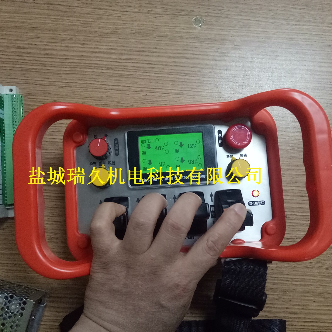 遙控器發(fā)射器采用腰跨式結(jié)構(gòu),三位兩通手動(dòng)復(fù)位撥鈕開關(guān)1只,兩位一通手動(dòng)復(fù)位旋鈕電源開關(guān)1只,兩位兩通手動(dòng)復(fù)位旋鈕開關(guān)1只,蘑菇頭急停按鈕1只?;魻柲M量推桿4只,各輸出1組0-10V及正反兩個(gè)繼電器常開點(diǎn)。遙控距離>150米,接收器電源電壓:DC24V。遙控器包含發(fā)射器和接收器各1只。