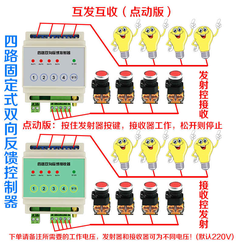 四路雙向無線控制器,兩只為一對,每只均具有發(fā)射和接收功能。 四路無線遙控開關(guān),開關(guān)信號無線傳輸模塊,采集點對點IO信號,水塔霧炮雙向反饋遙控器。特別適用于控制柜、操作臺之間的開關(guān)控制信號無線傳輸。傳輸距離遠(yuǎn)。每套包含兩只遙控器,每只遙控器采用軌道安裝,端子接線。兩只遙控器同時都具有發(fā)射和接收功能。A遙控器發(fā)射信號,B遙控器接收并輸出繼電器開關(guān)接點。B遙控器發(fā)射信號,A遙控器輸出繼電器信號。同時,遙控器具有手動按鈕控制功能。