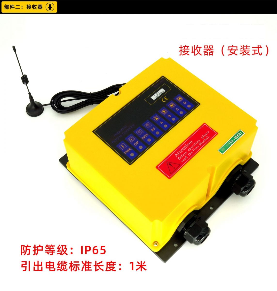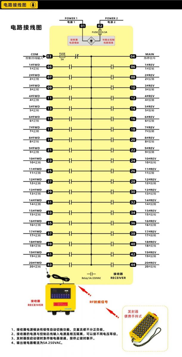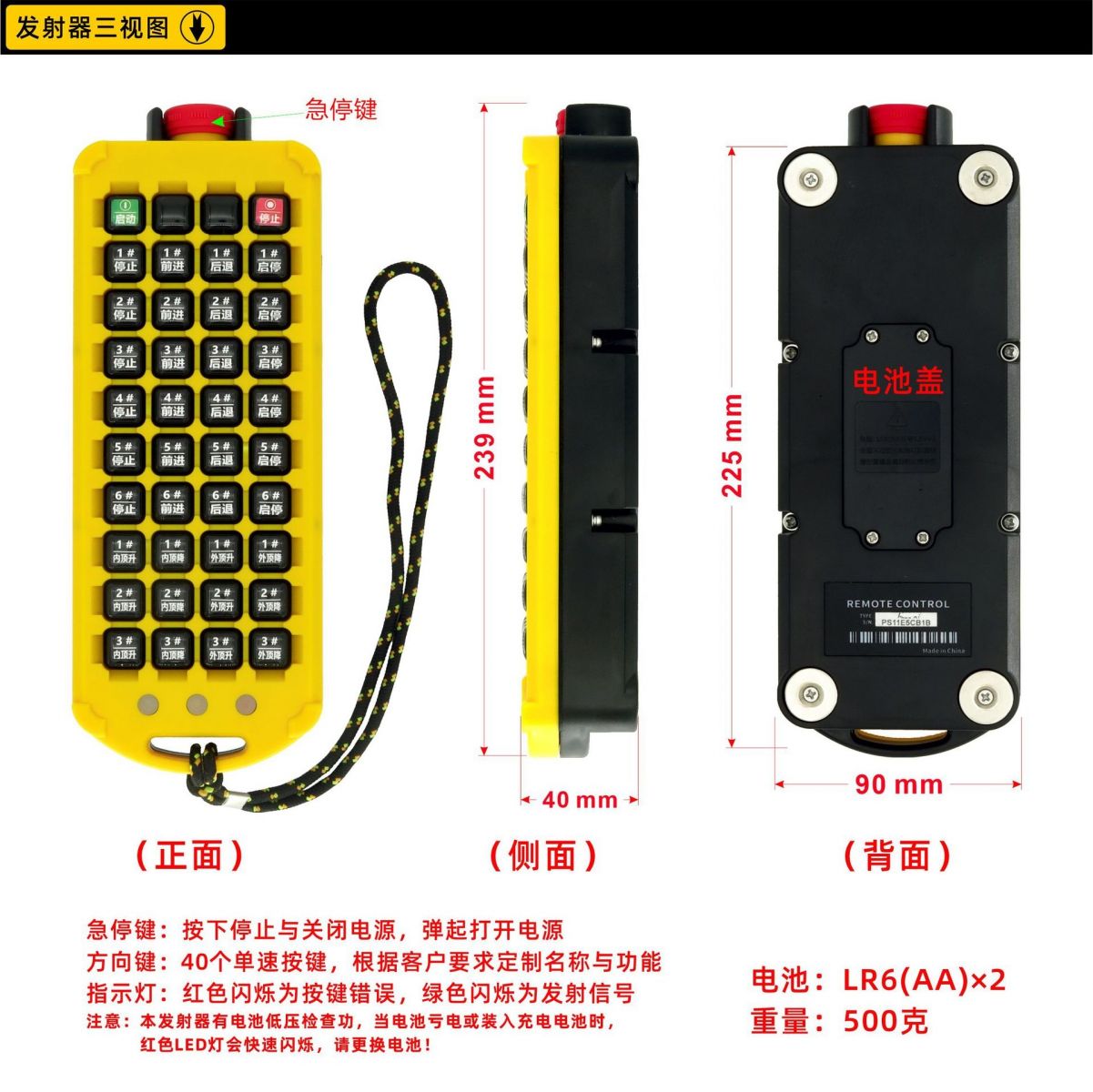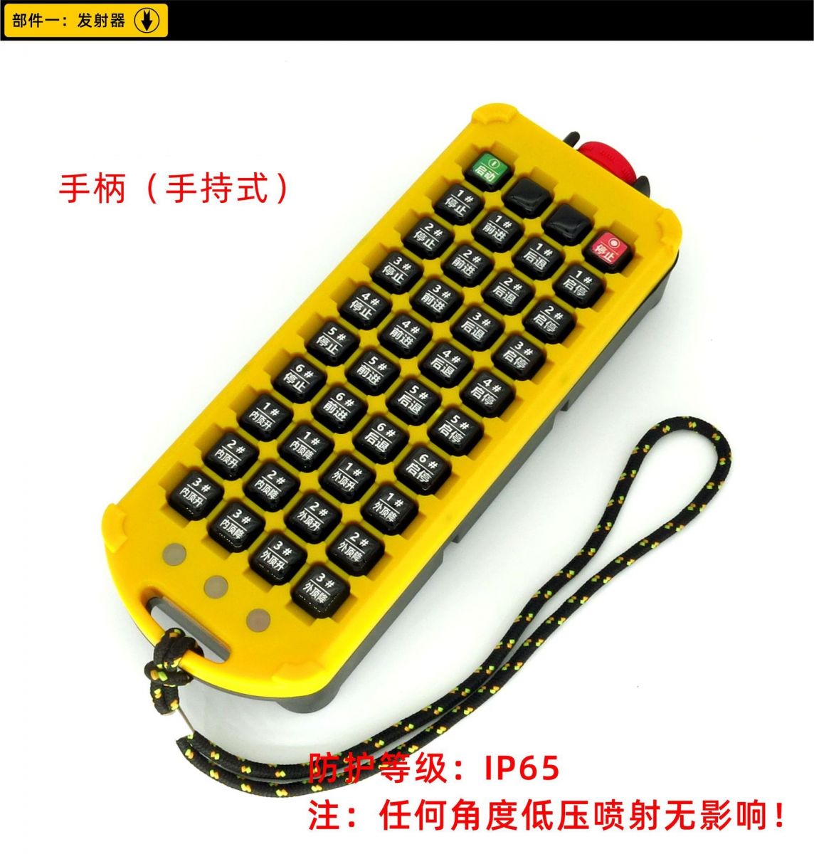 鹽城瑞久機(jī)電科技有限公司出品的RJ-A40S型工業(yè)遙控器,是我公司針對大點(diǎn)數(shù)控制要求的客戶開發(fā)的一款無線控制產(chǎn)品。至多可以獨(dú)立控制40個動作,動作之間可以設(shè)定一定的邏輯關(guān)系,譬如多鍵連鎖、互鎖、一鍵啟動、一鍵斷開,關(guān)聯(lián),定時等。 手柄采用手持式,防水設(shè)計(jì),按鍵名稱和功能可以定制,背面四顆強(qiáng)磁可以輕松吸附在金屬工件表面,防丟防摔。防護(hù)等級IP65,任何角度低壓噴射無影響。 頂部蘑菇頭急停,兩側(cè)防護(hù)設(shè)計(jì)。按下急停,發(fā)射器關(guān)閉電源,彈起急停打開電源。 發(fā)射器長度:239mm,寬度90mm,厚度40mm。重量500mg。采用兩節(jié)5號電池供電,發(fā)射器帶低壓檢測功能,當(dāng)電池虧電,紅色LED等會快速閃爍,提醒操作者更換電池。 接收機(jī)上下長度235mm,左右寬度220mm,厚度105mm,含電纜重量2000g。 接收機(jī)電源可以定制AC24V,AC36V,AC220V,AC380V,DC12V,DC24V,DC48V,DC110V等多種電壓。輸出繼電器載流能力為5A,250VAC。 包裝盒尺寸:480*245*155mm 頻率范圍:430~440MHz。 發(fā)射功率:10dbm。 遙控距離:100m。 安全碼:32Bit。 天線阻抗:50Ω。 天線形式:內(nèi)置。 外殼材質(zhì):丙稀腈-丁二烯-苯乙烯共聚物(ABS)。 待機(jī)電流:<3微安。 安裝現(xiàn)場環(huán)境:室內(nèi)安裝,并盡量避開強(qiáng)烈震動和強(qiáng)磁。 RJ-A40S型工業(yè)遙控器適用于40個及以下控制點(diǎn)數(shù)的工業(yè)設(shè)備無線控制,按鍵功能可以設(shè)定為點(diǎn)動(按住繼電器閉合,松手?jǐn)嚅_)、自鎖(按一下按鍵,對應(yīng)繼電器閉合,再按一次斷開)、開關(guān)功能(兩個按鍵控制一個繼電器,第一個按鍵按一下,繼電器閉合,第二個按鍵按一下繼電器斷開)。也可以實(shí)現(xiàn)多鍵的復(fù)合邏輯功能。如一二三四五檔切換等。