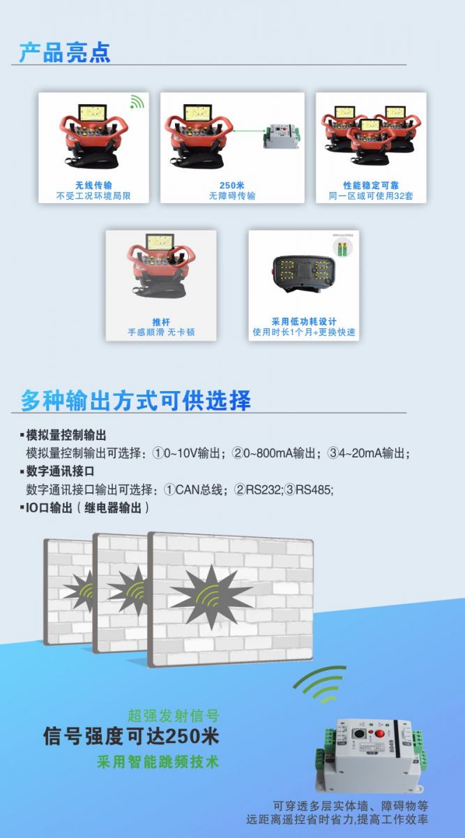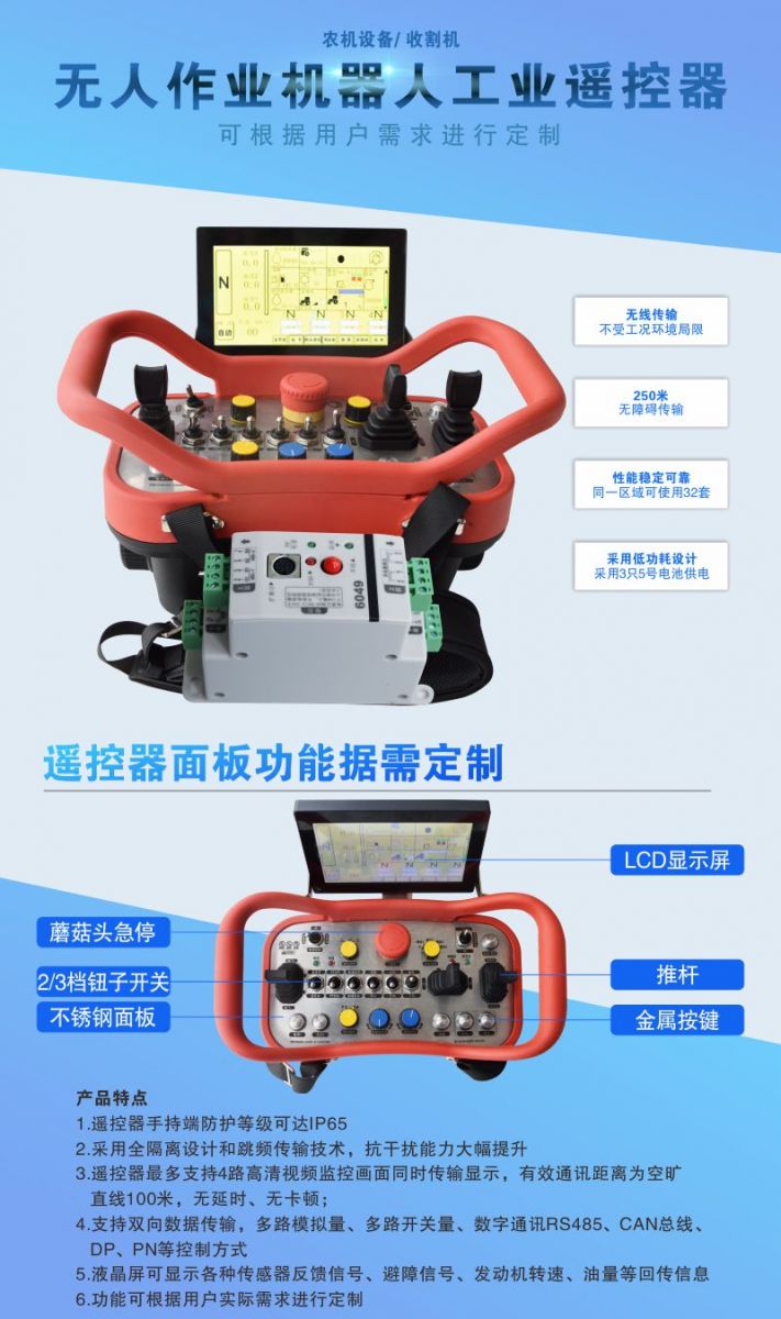 該系列產(chǎn)品應(yīng)用于各種工農(nóng)業(yè)機(jī)械設(shè)備,以上圖片只是客戶定制遙控器案例,圖片產(chǎn)品只能作為參考,具體控制功能、面板布局、操作形式、輸出形式等還需與技術(shù)溝通。